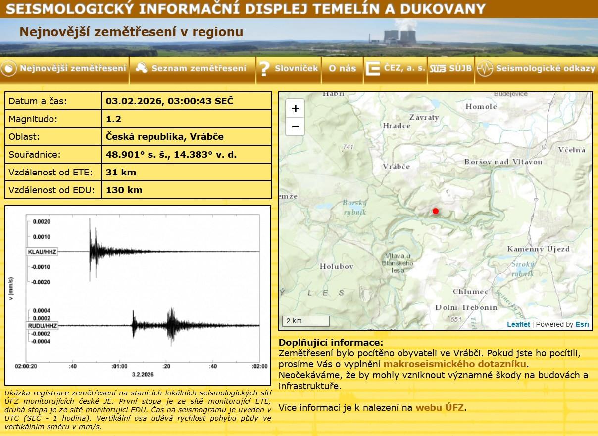 Seismologové naměřili 3. února v noci ve Vrábči na Českobudějovicku zemětřesení o síle 1,2 stupně Richterovy škály. Je to vůbec poprvé, co se v této oblasti otřesy půdy objevily.