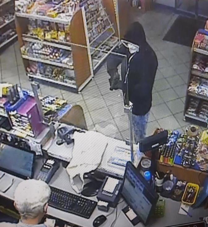 Na sobě měl oblečenou mikinu tmavé barvy s kapucou, modré kalhoty, přes obličej měl roušku, na očích sluneční brýle a na rukou měl nasazené černé rukavice. V ruce držel střelnou zbraň, se kterou namířil na muže za pultem a dožadoval se vydání peněz, které mu obsluha vydala. Pachatel požadoval také stírací losy a mobilní telefon. Následně místo činu opustil a odešel směrem na Plzeň.